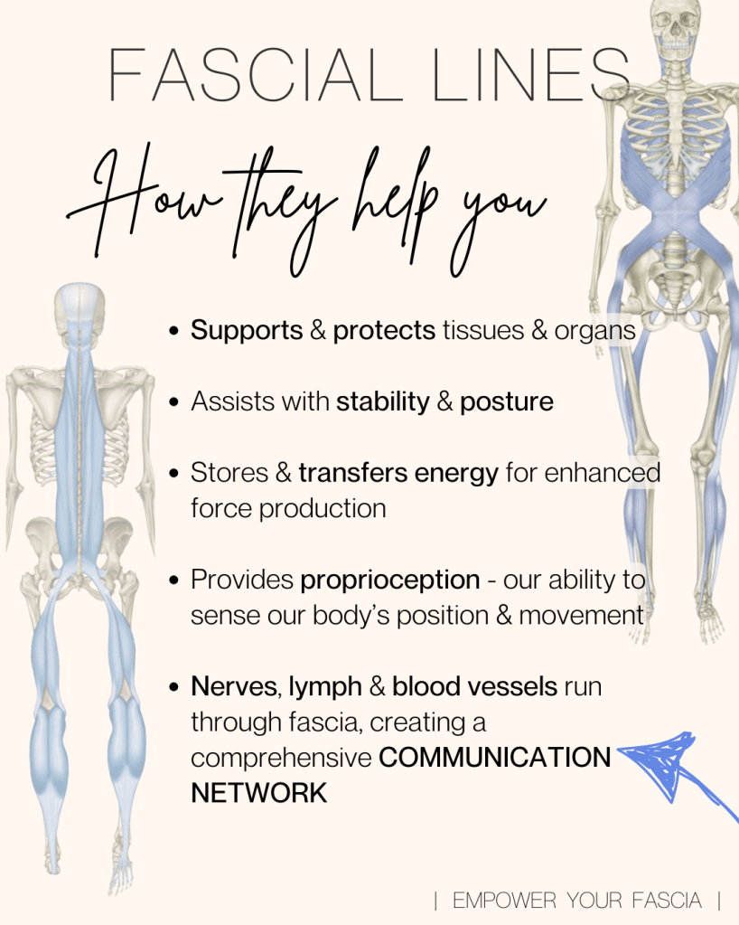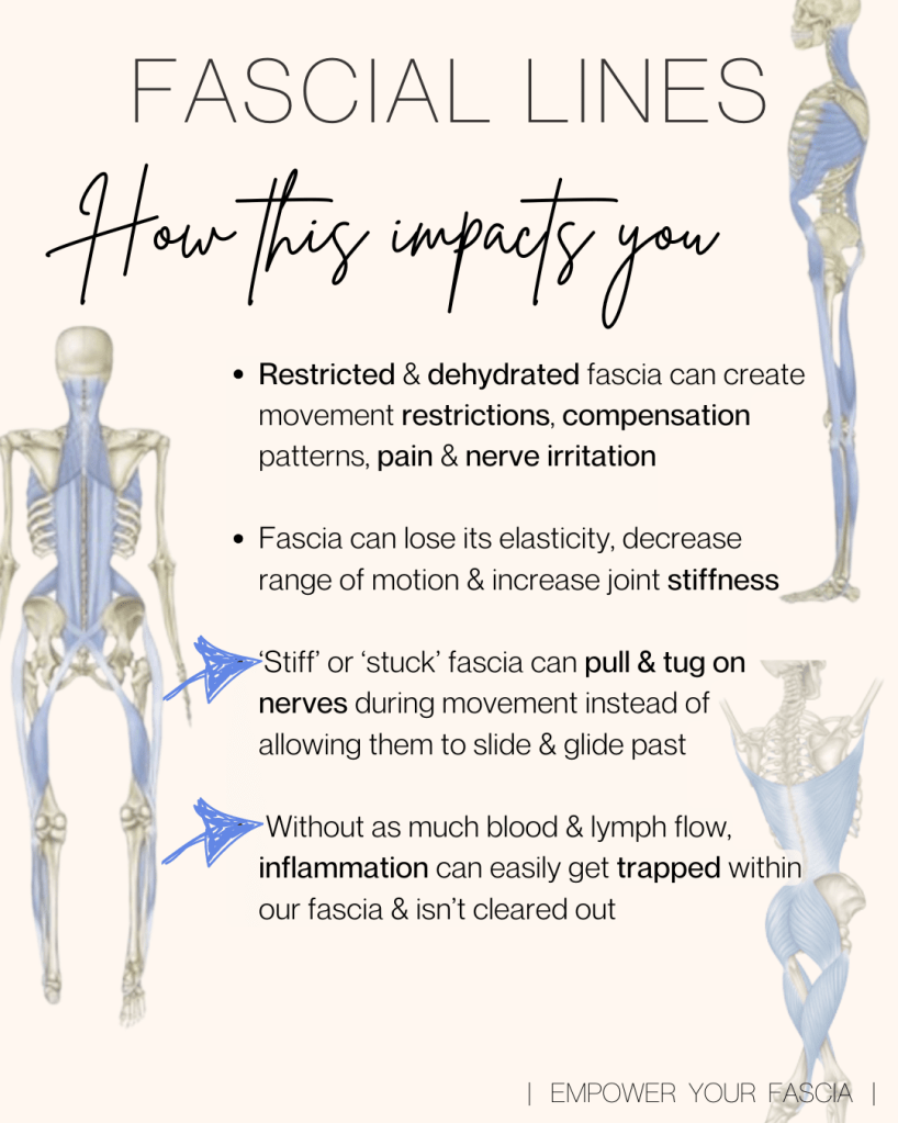 I use these fascial chains to ‘trace’ pathways of restriction throughout the body. Using a skin rolling manual therapy technique I can feel the direction a tissue’s restriction or resistance is coming from — we can follow these through every part of the body for a more holistic & comprehensive view of structural contributing factors.